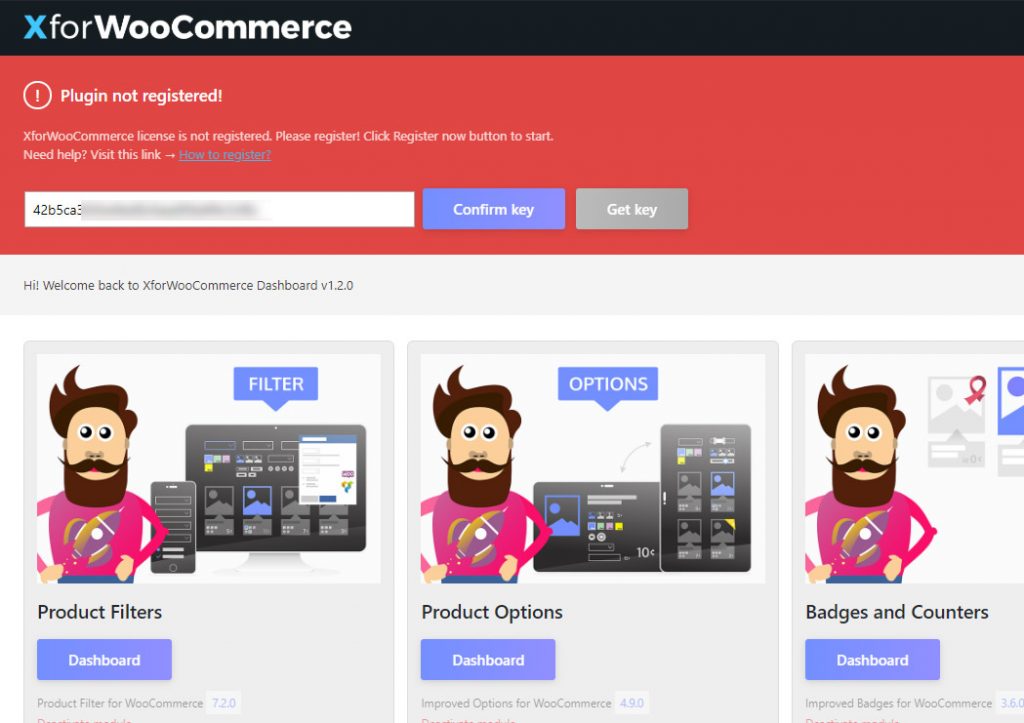 Once clicked an XforWooCommerce.com registration key field will appear. Paste the key you just got here and click Confirm key.